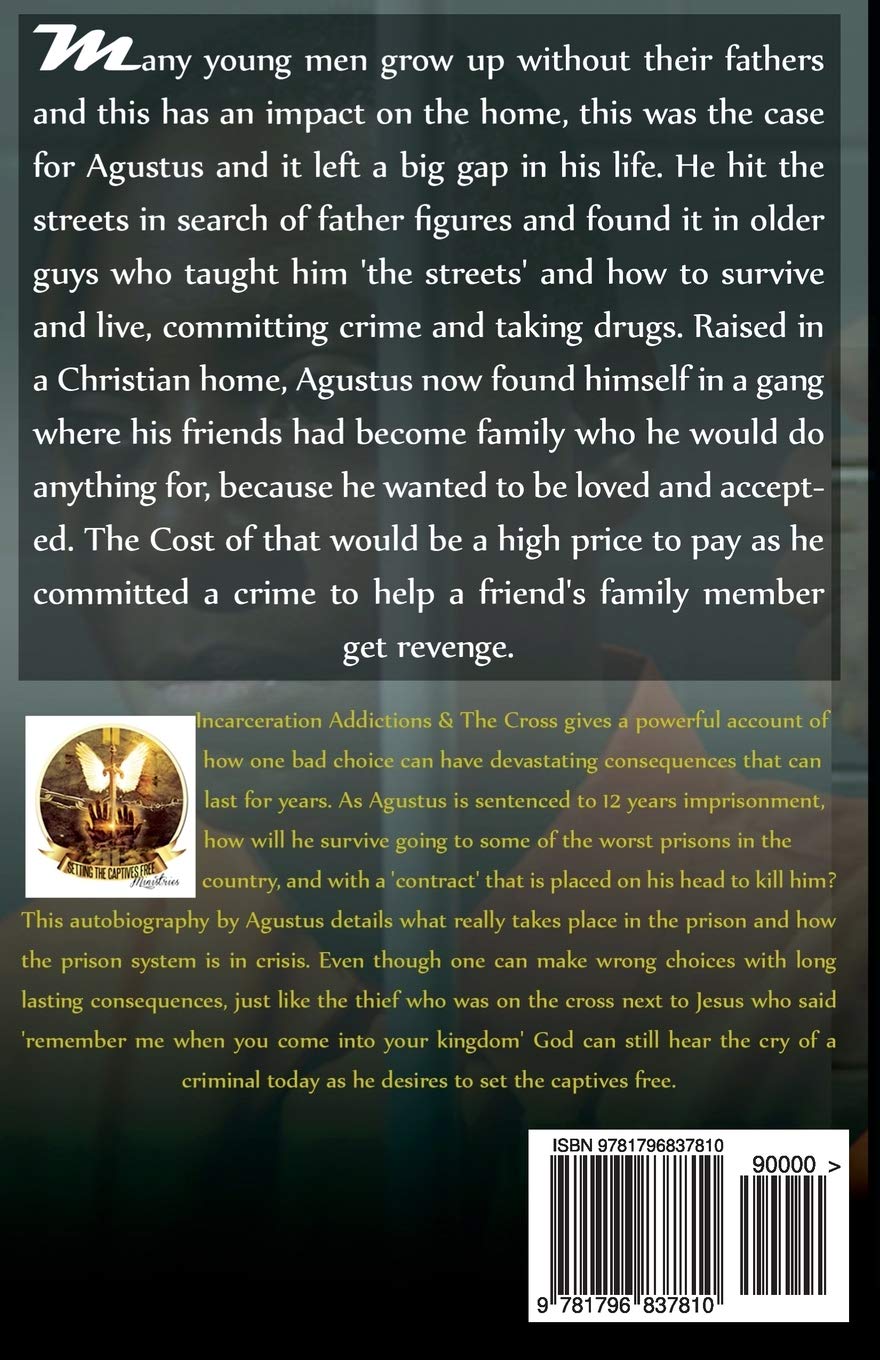 Many young men grow up without their fathers and this has an impact on the home, this was the case for Agustus and it left a big gap in his life. He hit the streets in search of father figures and found it in older guys who taught him ‘the streets’ and how to survive and live, committing crime and taking drugs. Raised in a Christian home, Agustus now found himself in a gang where his friends had become family who he would do anything for, because he wanted to be loved and accepted. The cost of that would be a high price to pay as he committed a crime to help a friend’s family member get revenge. Incarceration Addictions & the cross gives a powerful account of how one bad choice can have devastating consequences that can last for years. As Agustus is sentenced to 12 years imprisonment, how will he survive going to some of the worst prisons in the country, and with a ‘contract’ that is placed on his head to kill him? This autobiography by Agustus details what really takes place in prison and how the prison system is in crisis. Even though one can make wrong choices with long lasting consequences, just like the thief who was on the cross next to Jesus who said ‘remember me when you come into your kingdom’ God can still hear the cry of a criminal today as he desires to set the captives free.